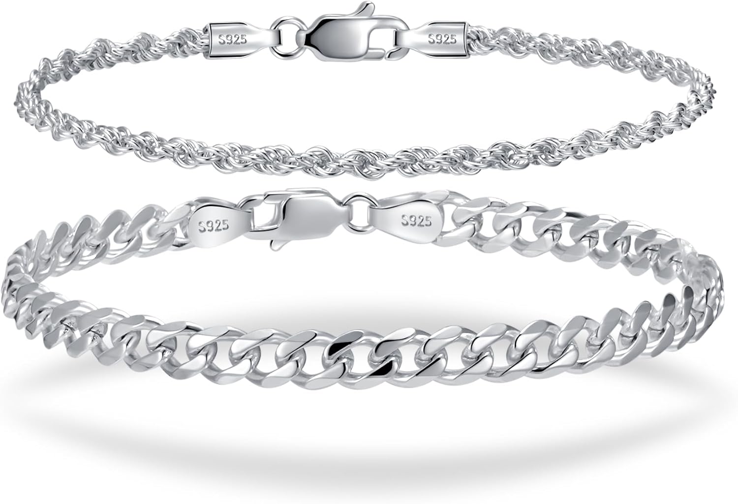 BRAYEG 2 Pcs 925 Sterling Silver Cuban Chain Bracelet and Rope Link Chain Set for Men's&woman,Trendy hip-hop style ,Elevate your style with our men's bracelet set, featuring classic Rope Link Chain or Cuban link chains crafted from premium 925 sterling silver. Designed for versatility, these Men's Silver bracelets can be worn individually or layered together, making them suitable for both casual and formal occasions. Fashion Gift for Dad/Husband/Boyfriend/mother's jewelry, No fading/waterproof/Hypoallergenic/Durable&Stylish unisex. At BRAYEG, we believe in creating timeless pieces that resonate with personal stories. Our artisans meticulously craft each bracelet, ensuring durability and a polished finish that resists tarnish. Whether you're dressing up for a special event or adding a touch of elegance to your daily attire, this bracelet set complements any outfit. Fit: Features an length ranging from 7 to 9 inches, accommodating various wrist sizes comfortably. Elegant Packaging: Comes in a sophisticated gift box, making it an ideal present for special occasions like Father's Day mother's Day or anniversaries. Timeless Appeal: A classic accessory that adds a touch of sophistication to both casual and formal ensembles. 925 Sterling Silver Cuban Chain Bracelet and Rope Chain while the secure lobster clasp offers reliability, Whether dressing up for a formal event or Trendy hip-hop style embracing a casual look, these bracelets adapt effortlessly. Layer both chains for a bold statement or wear separately to complement minimalist outfits. Inspired by hip-hop culture and refined with modern aesthetics, they bridge rugged masculinity and understated sophistication The BRAYEG Legacy Born from Italian jewelry craftsmanship, BRAYEG merges decades of artisanal expertise with ethical practices. Each bracelet is hallmarked "925" for purity and rigorously tested for hypoallergenic safety, making it ideal for sensitive skin. Our commitment to eco-friendly materials ensures every piece is responsibly crafted Bullet Points: Versatile Design: 925 Sterling Silver Cuban Chain Bracelet and 925 Sterling Silver Rope Chain Bracelet stacking chains Includes or Rope Link Chain or Cuban link chains, allowing for individual wear or stylish layering Couple Bracelets to suit any occasion. Premium Material: Made from authentic 925 sterling silver, ensuring hypoallergenic properties and long-lasting shine. Elegant Packaging: Comes in a sophisticated gift box, making it an ideal present for special occasions like Dad/Husband/Boyfriend fashion jewelry Father's Day or anniversaries. The perfect fashion jewelry gift: Comes in a sophisticated gift box,Our Exquisite layering Cuban Chain Bracelet& Rope Link Chain is a unique and Sincere Gift for Boyfriend, Couple ,Dad,Husband Moms, Sisters, Lovers, Friends, Family, Birthday, Christmas, Mother's Day, Valentine's Day,,Grilfrieng,loved ones,Thanksgiving or anniversaries