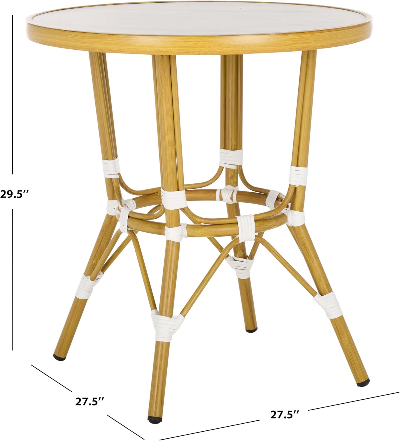 Enhance your dining experience with SAFAVIEH's Pomona Bistro Dining Table. Perfect for both indoor and outdoor use, it features a chic white and brown colorway with wrapped bamboo details and a marble-inspired top. This table brings a touch of elegance and sophistication to any setting.